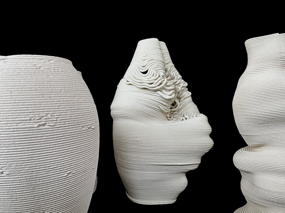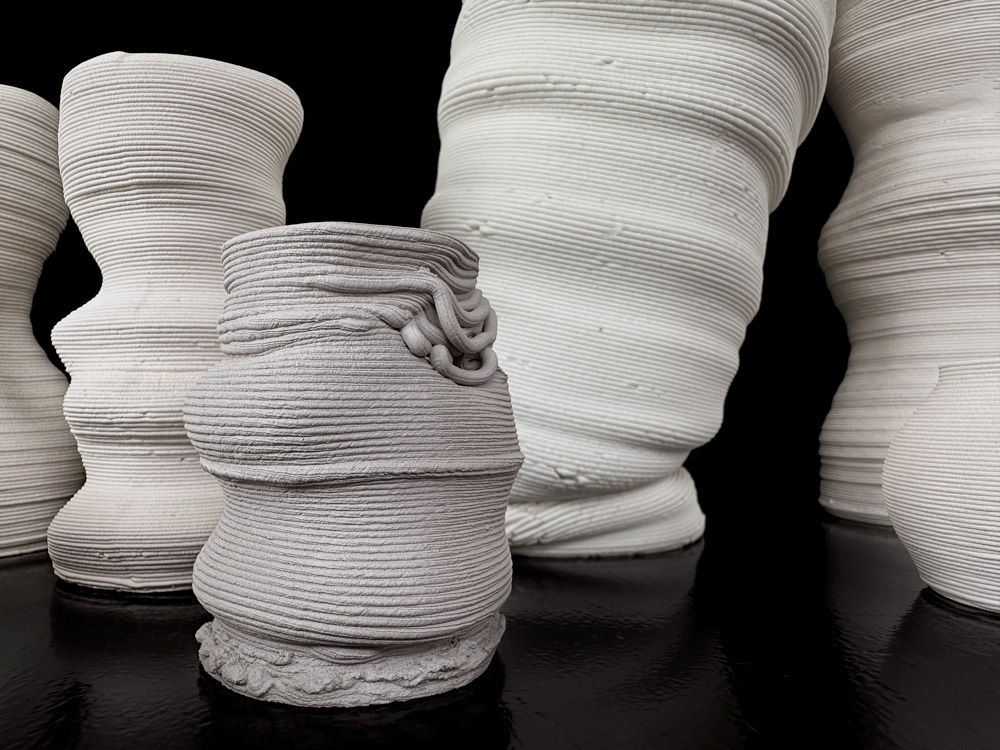 Unique. 3D printed stoneware and porcelain, various dimensions. Objects vary between approx. 26 x 12 cm and 5 x 7 cm; Configuration as pictured, 167 x 30 x 30 cm.