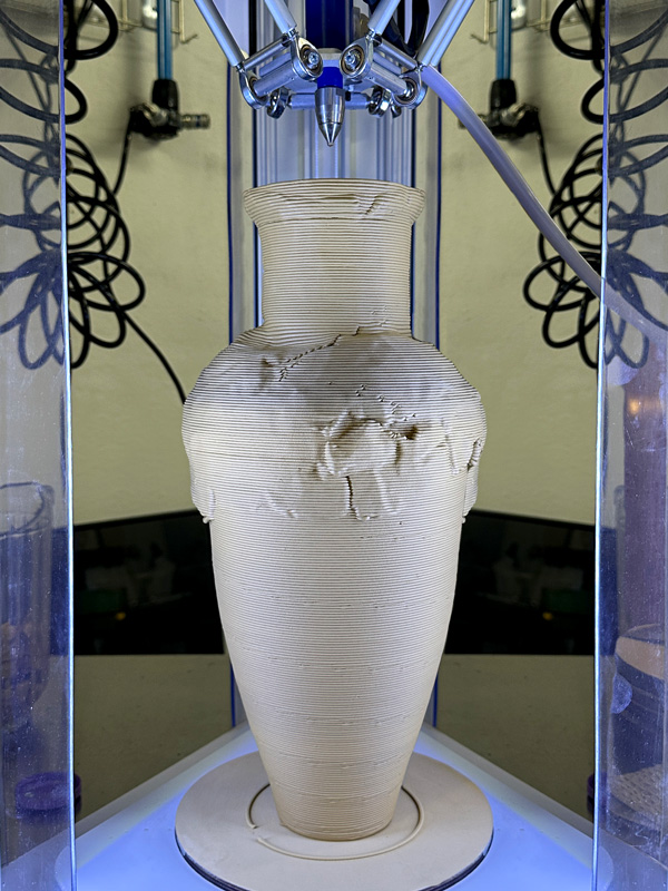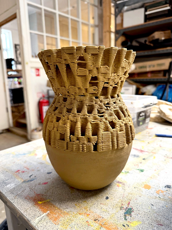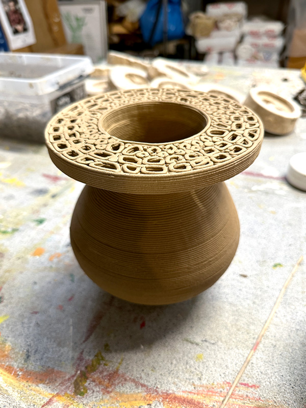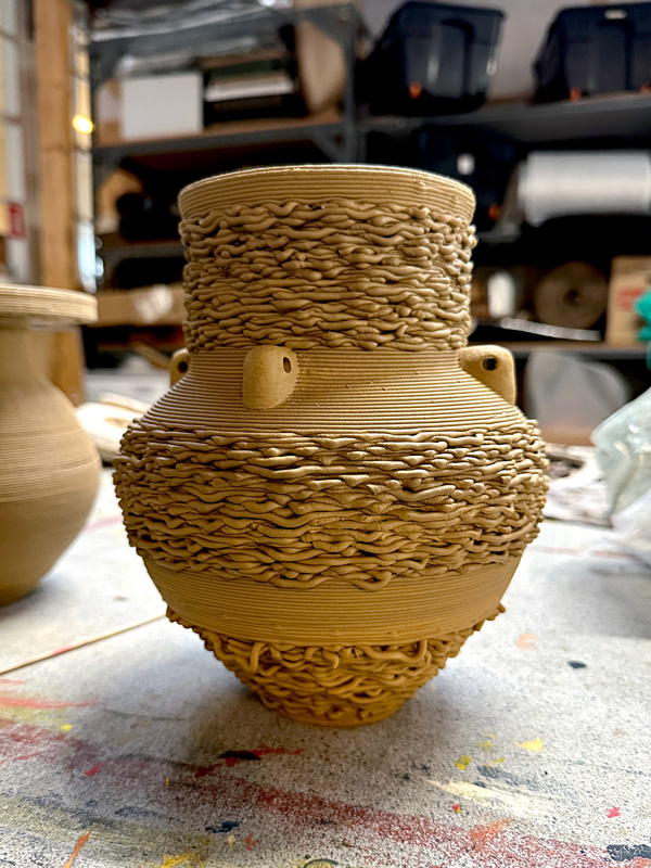Looping pot, 3D-printed and hand-sculpted mixed clay, 20 x 19 x 25 cm (greenware).