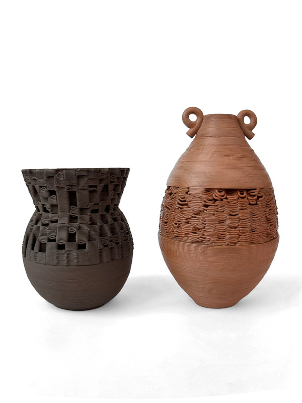 Mug vase and Window jar; 3D printed and hand sculpted earthenware, wax and mineral pigment, 2025. 15 x 15 x 35 cm and 18 x 18 x 20 cm.